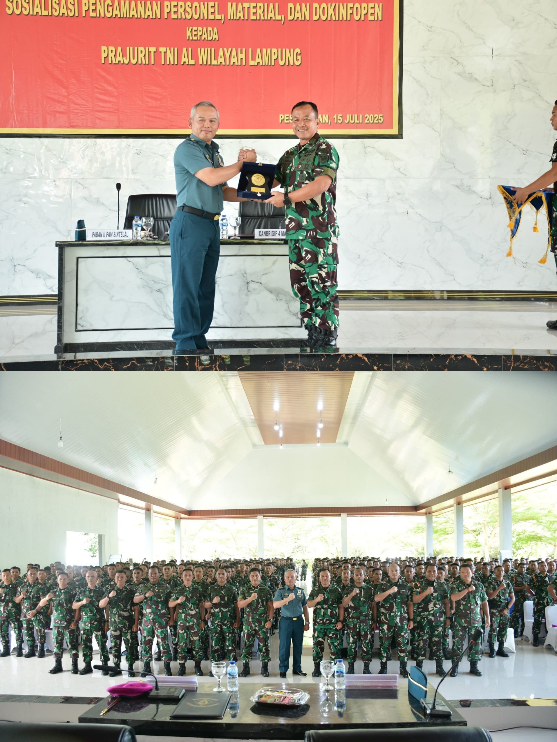 Danbrigif 4 Mar/BS Kolonel Marinir Supriadi Tarigan, S.I.P., M.M., turut menghadiri acara dalam kegiatan Sosialisasi Pengamanan Personel, Material, dan Dokumen Informasi Terbuka dan Tertutup (Dokimfopen) di Kelas Gobang Yonif 7 Mar. Ketapang, Teluk Pandan, Pesawaran, Lampung. Selasa (15/07/2025).