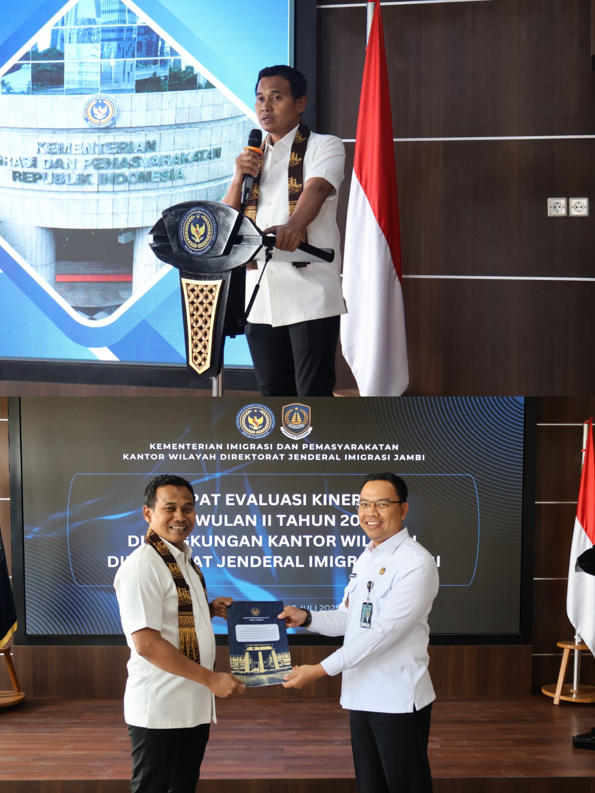 Kanwil Ditjen Imigrasi Jambi menggelar Rapat Evaluasi Triwulan II yang dipusatkan di Kantor Imigrasi Kelas II TPI Kuala Tungkal. Kegiatan ini dihadiri langsung oleh Kakanwil, dan seluruh Kakanim beserta jajarannya, sebagai forum evaluasi pelaksanaan anggaran dan tugas fungsi (tusi) keimigrasian Triwulan II Tahun 2025. Selain sebagai bentuk pengawasan dan perencanaan strategis, rapat ini juga mencerminkan komitmen kuat Kanwil Imigrasi Jambi dalam mendukung penuh 8 Misi Asta Cita Presiden Prabowo Subianto dan 13 Program Akselerasi Menteri Imipas, Bapak Agus Adrianto, khususnya melalui penguatan inovasi pelayanan publik serta peningkatan peran sosial keimigrasian di tengah masyarakat. (17/07/2025).